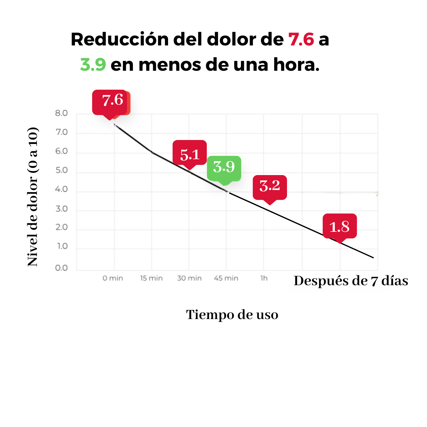 📉 Reducción del dolor de 7.6 a 3.9 en menos de una hora.